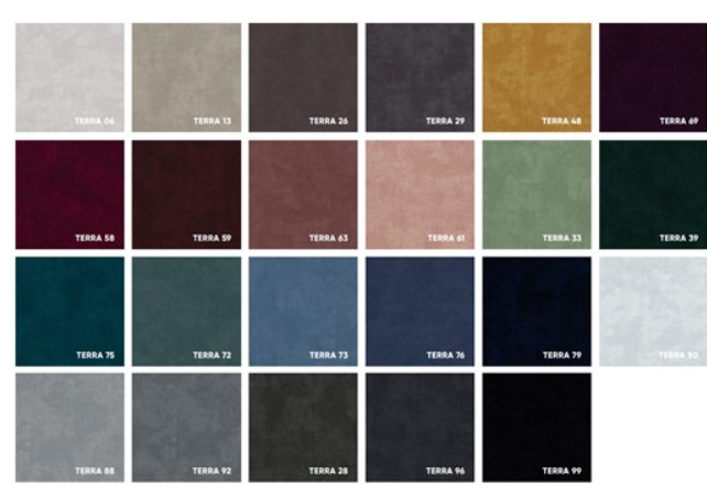 Kolekcja TERRA to przyjemna w dotyku tkanina obiciowa o ciekawej strukturze. Dostępna jest w szerokiej gamie kolorystycznej, a zaawansowana technologia gwarantuje wysoką wytrzymałość. Przyjazna zwierzętom technologia Pet Friendly ułatwia usuwanie sierści i zapobiega wbijaniu się jej we wnętrze tkaniny.