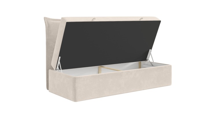 Łóżko BASIA charakteryzuje się stylowym wezgłowiem z komfortową pianką, zdobione pionową "kedrą" i eleganckimi guzikami, które dodają charakteru oraz wizualnego zainteresowania. Oparcie otoczone jest atrakcyjnym batonem, co podkreśla wyrafinowany design łóżka. Praktyczna podstawa z pojemnikiem na pościel, otwierana od przodu, zapewnia dodatkową przestrzeń do przechowywania, maksymalizując funkcjonalność mebla.