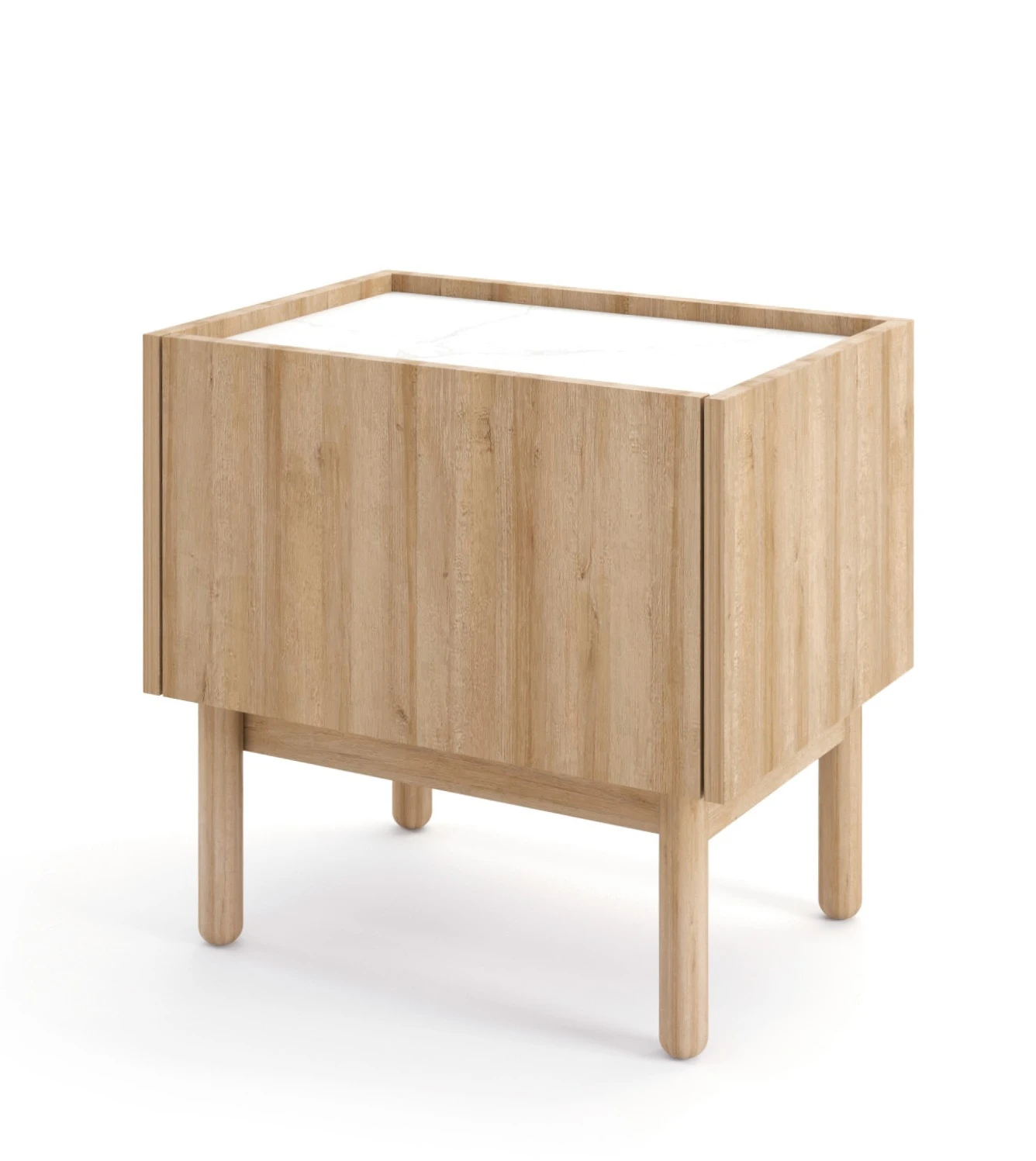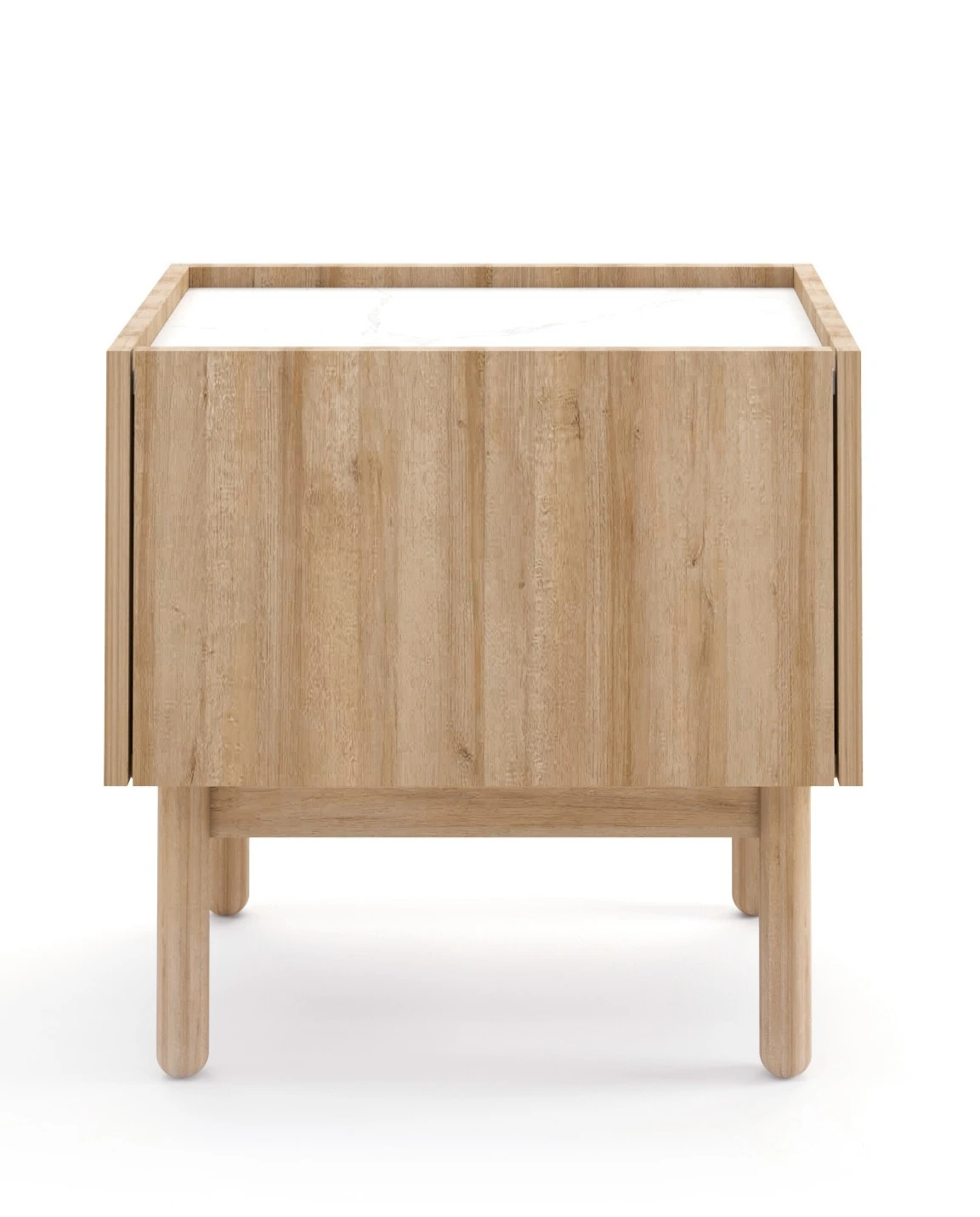 ✅ Stolik nocny dąb riviera/ marmur bianco z kolekcji BOHO – propozycję dla osób, które cenią minimalistyczną formę, wysoką jakość wykonania i subtelne, dekoracyjne detale.
