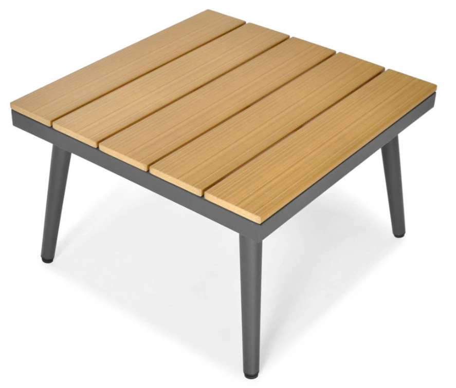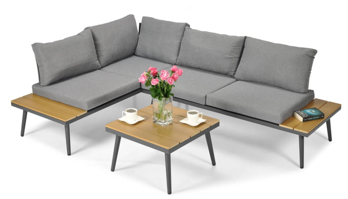 Minimalistyczny zestaw mebli ogrodowych w postaci narożnika i stolika kawowego doskonale wkomponuje się w niejeden ogród, taras czy patio.