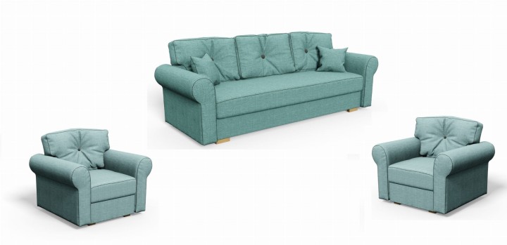 Skład zestawu: kanapa 3-osobowa ( rozkładana) + 2 fotele.