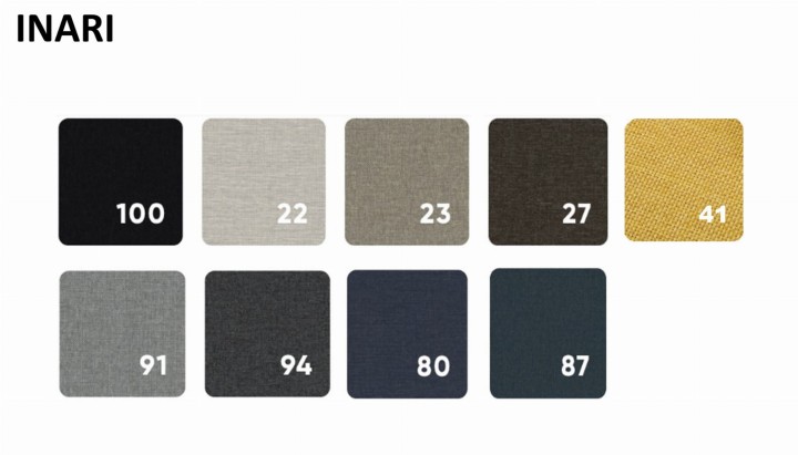 Materiał obiciowy INARI ze splotem imitującym naturalną, lnianą tkaninę. Nitki o różnych odcieniach sprawiają że materiał nie jest jednokolorowy, a to znacznie poprawia walory użytkowe mebla. Proste i mocne tkanie sprawia, że INARI to tkanina wytrzymała i odporna na wycieranie. Jest to idealny materiał do codziennego użytku. Posiada wysoką odporność na blaknięcie.