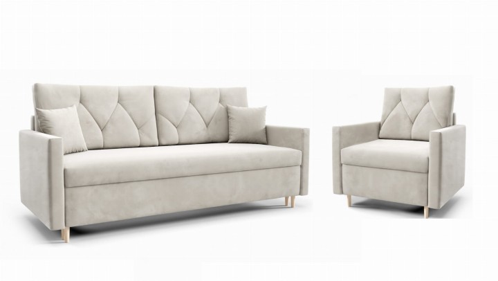 W skład zestaw wchodzi kanapa 3 os. rozkładana oraz fotel