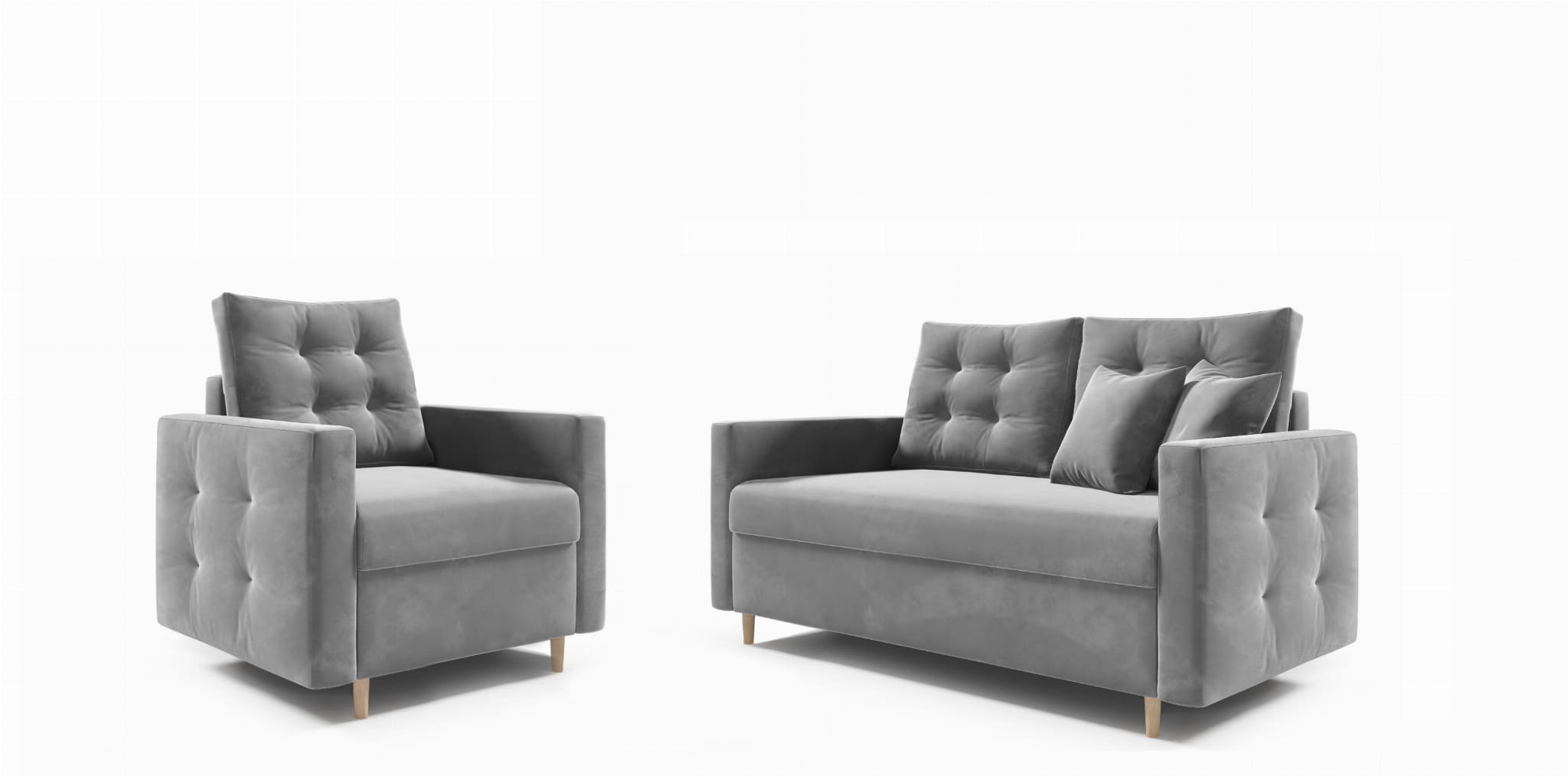 Skład zestawu: kanapa 2 osobowa nierozkładana + fotel.
