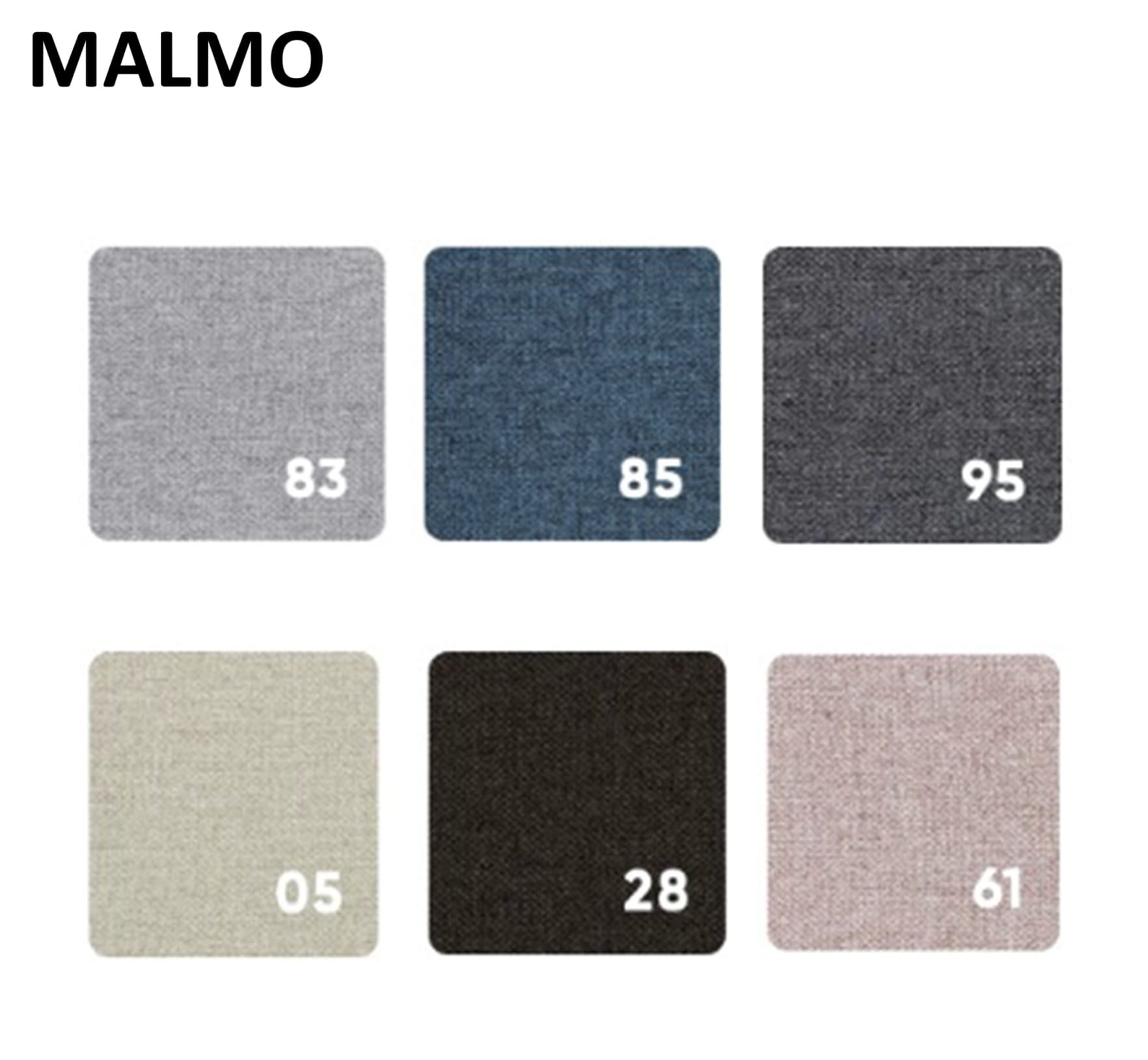 Tkanina MALMO wyprodukowana została w 100% z surowca poliestrowego. Materiał należy do grupy plecionek, które znane są ze swojej wytrzymałości. Tkanina MALMO uzyskała w teście na ścieranie wynik 55 000 cykli. Co daje wysoką odporność na wycieranie podczas siedzenia. Tkanina MALMO odznacza się również odpornością na mechacenie i wybarwienia przez światło sztuczne. W ten sposób meble z tym materiałem obiciowym, zachowają dobry wygląd na dłużej.